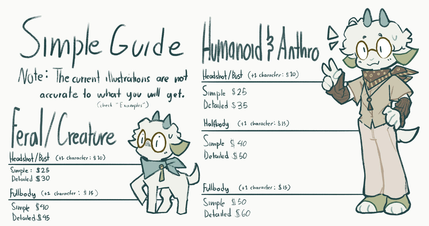 Doodle pages have a separate pricing to my normal comms. Depending on the character, the price may range from $40-$50. This will NOT include a fullbody.It will mostly contain headshots, busts and halfbodies. If you specifically want a fullbody similar to the second image but rendered, the price will be $60-$75. They take a while to do.Keep note each doodle will be shaded.